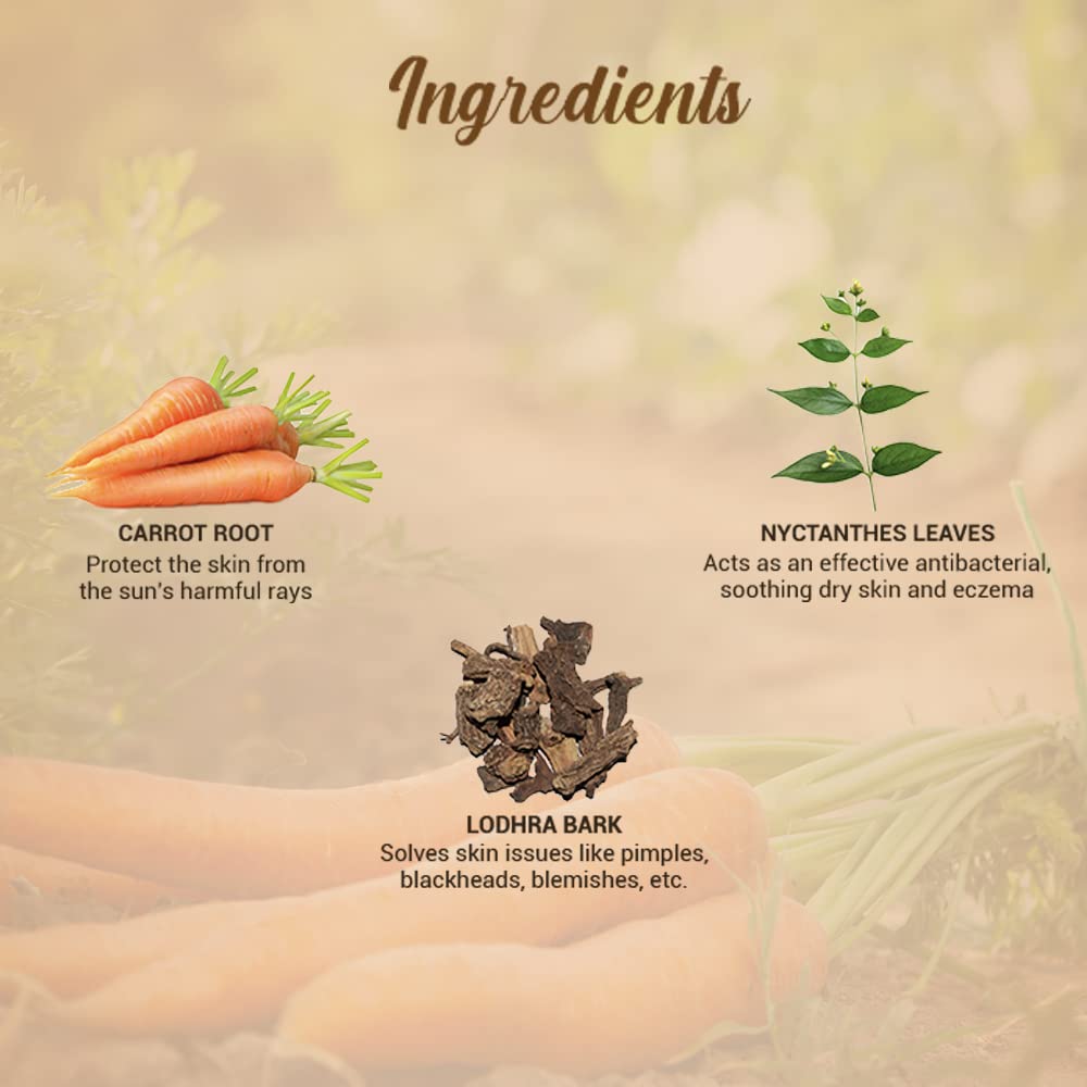 - Key Ingredients: This sun lotion for face is infused with carrot root goodness, which protects the skin from sun damage. Nyctanthes Leaf soothes eczema and dry skin, along with Lodhra bark which treats pimples, bleak heads, and blemishes.
