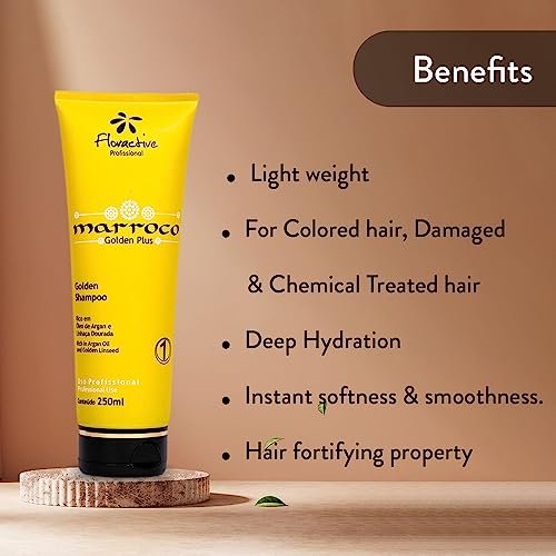 - The Marroco Golden Plus Shampoo is formulated with Argan oil, Omega 3 and 6, vitamins, cationic silicones, golden linseed, and Shea butter.