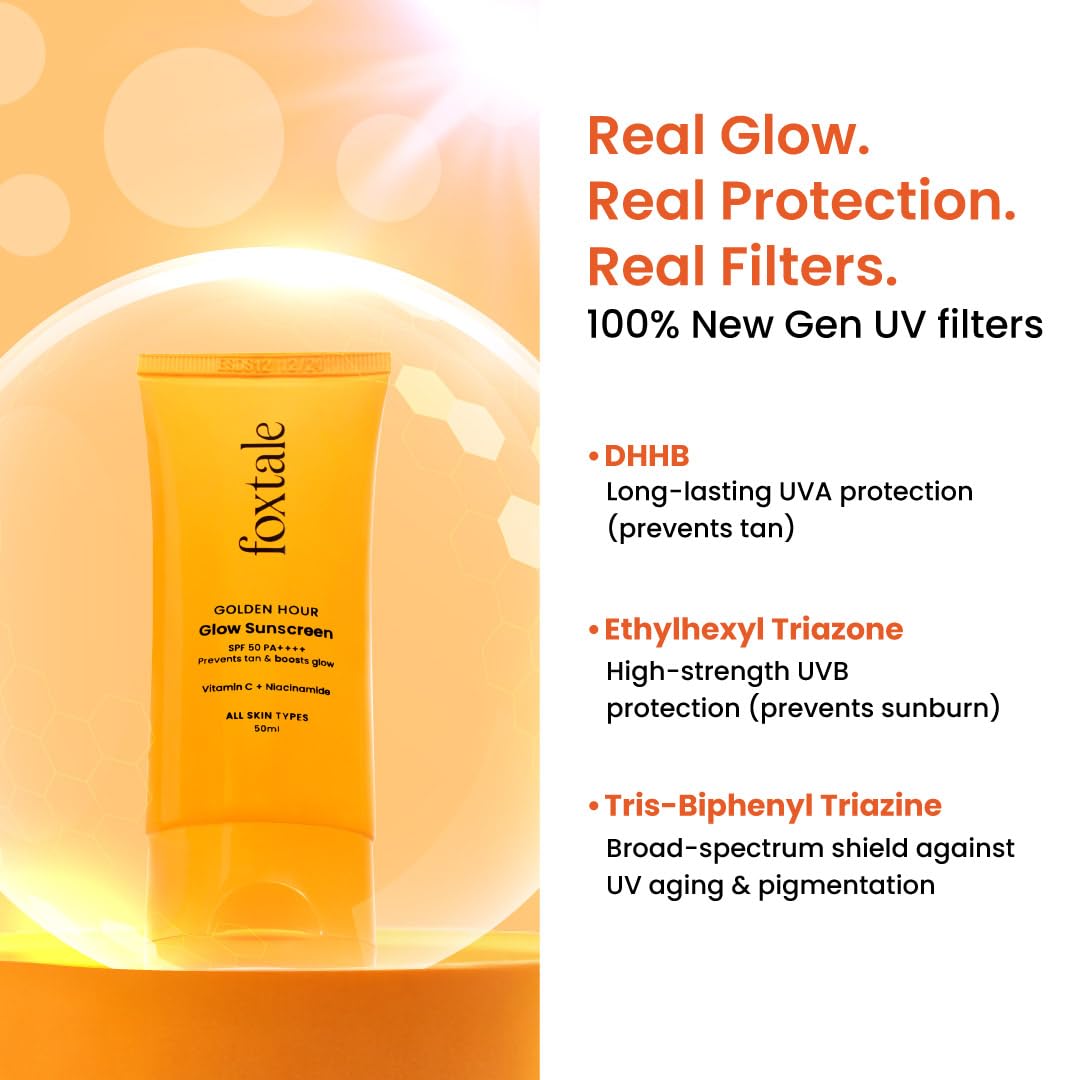 Foxtale Glow Sunscreen SPF 50 PA++++ with Vitamin C & Niacinamide, In-Vivo Tested, Sensitive-Skin Friendly, Made with 100% New-Gen Filters & EU Approved, Lightweight, Non-Greasy, No White Cast 50ml