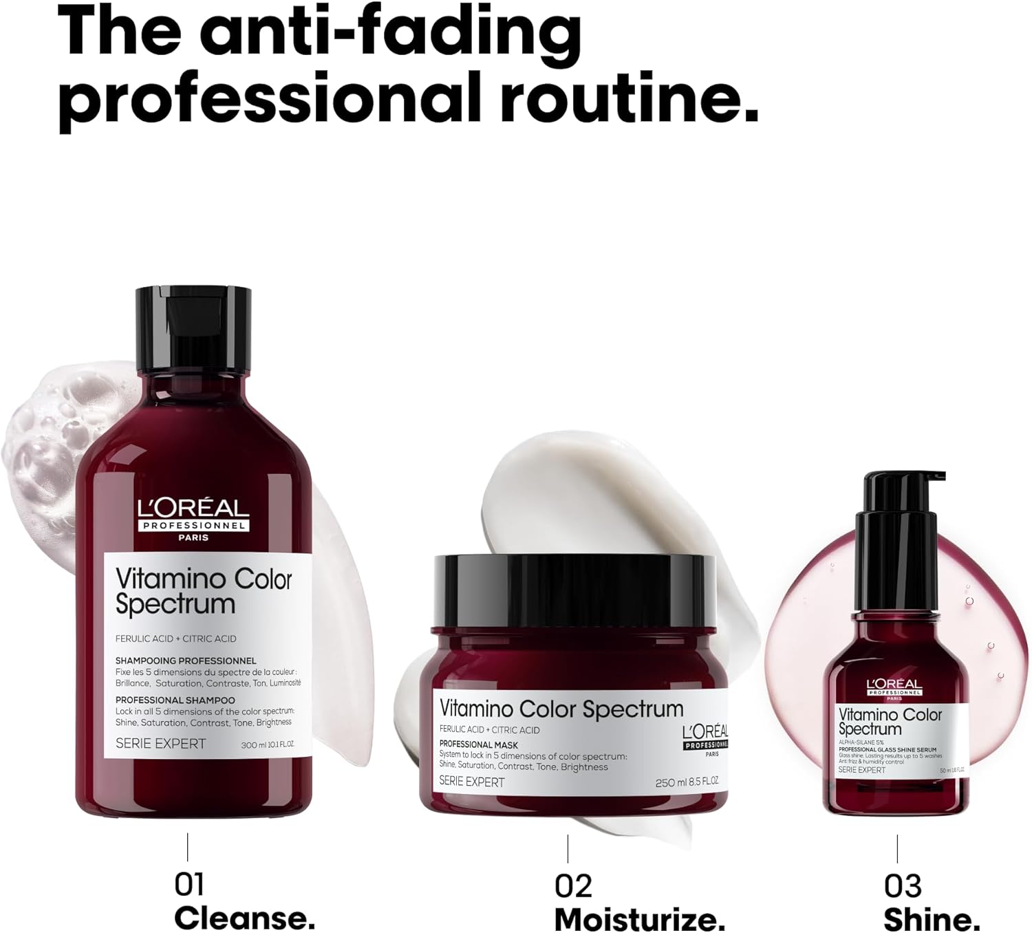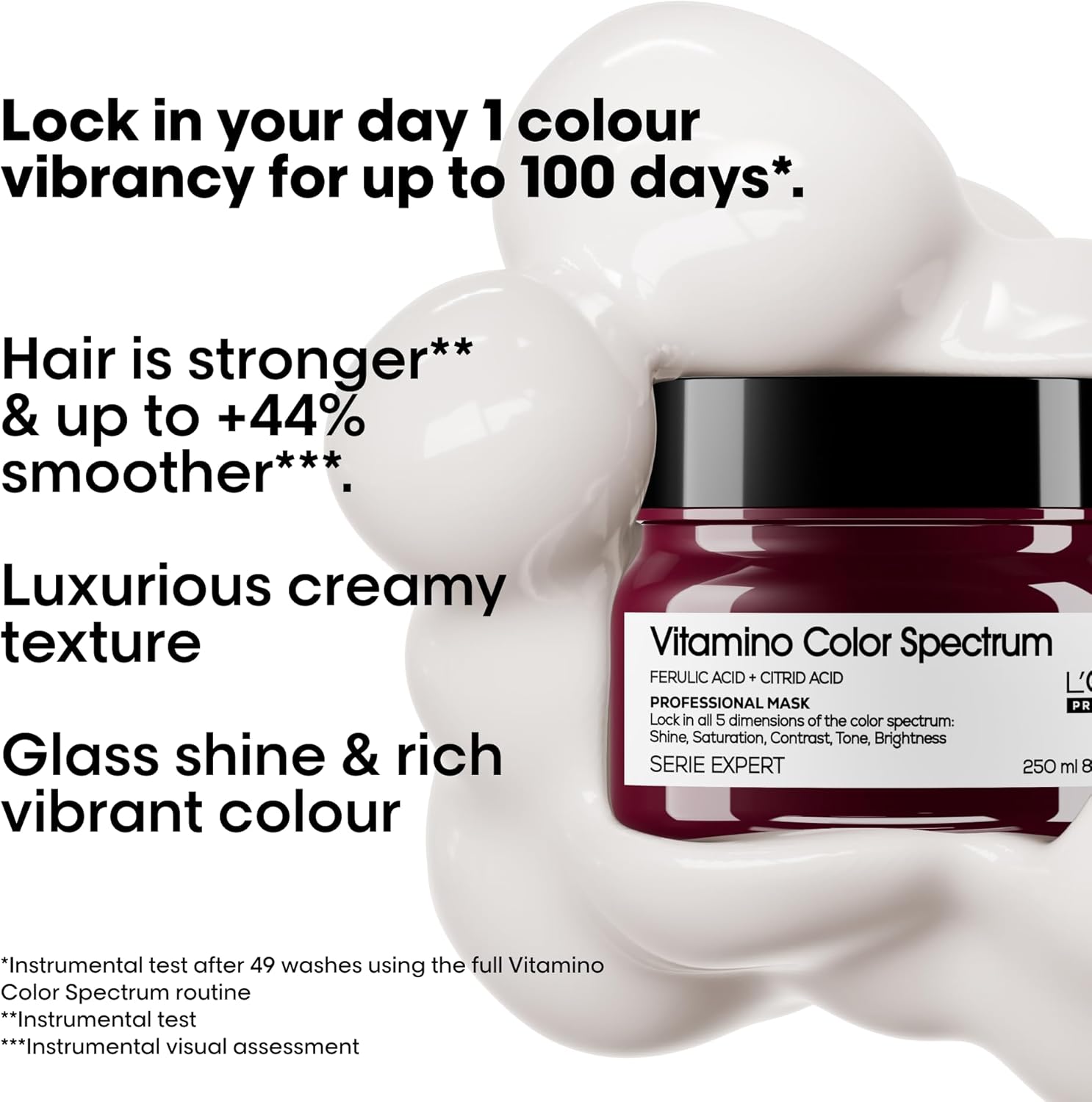 Lock in your day 1 colour vibrancy for up to 100 days* with Vitamino Color Spectrum Professional Shampoo and Rinse-Off Hair Mask by L'Oreal Professionnel. Hair is stronger and smoother**, and up to +44% smoother hair***. Formulated with Ferulic Acid + Citric Acid, the system locks dyes in the hair fibre to protect all 5 of the colour dimensions****. Proven efficacy on the 5 dimensions**** for ultimate coloured hair protection: - Shine: High glass shine*** - Vibrancy: Rich, vibrant colours - Contrast: Optimal perception between multiple shades - Tone: Helps neutralise unwanted reflects - Brightness: Level of brightness and darkness are well preserved How to: Apply shampoo & rinse thoroughly. After shampooing, apply rinse off mask. Section your damp hair in two sections. Distribute evenly onto each section. Work through the hair from lengths to ends and detangle with your fingers. Leave in for 3-5 minutes. Rinse thoroughly. Followed by Vitamino Color Spectrum Glass shine serum leave in. Welcome to our world of L'Oreal Professionnel Since our invention of hair color more than 110 years ago, L’Oréal Professionnel has pushed the boundaries of science & technology through our obsession with innovation, tech & safety for stylists and women. Now introducing Vitamino Colour spectrum to provide the ultimate colour protection. *Instrumental test after 49 washes using the full Vitamino Color Spectrum routine **Instrumental test ***Instrumental test after use of full range vs unwashed hair ***Instrumental visual assessment ****Instrumental test after continued use of the full Vitamino Color Spectrum routine