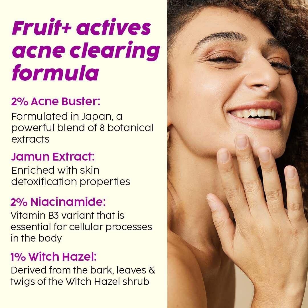 - Reduces Active Acne: Reduces the visibility of active acne & skin blemishes. The fruit+actives combination assists in skin detoxification & acne reduction.