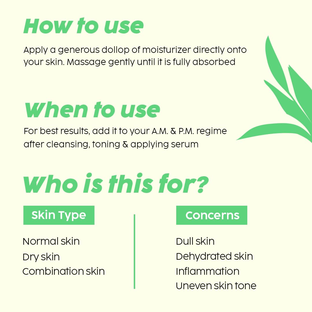 - How to use: Apply a generous dollop of moisturizer directly onto your skin. Massage gently until it is fully absorbed. Add it to your daily A.M. & P.M. regime after cleansing, toning & applying serum.
