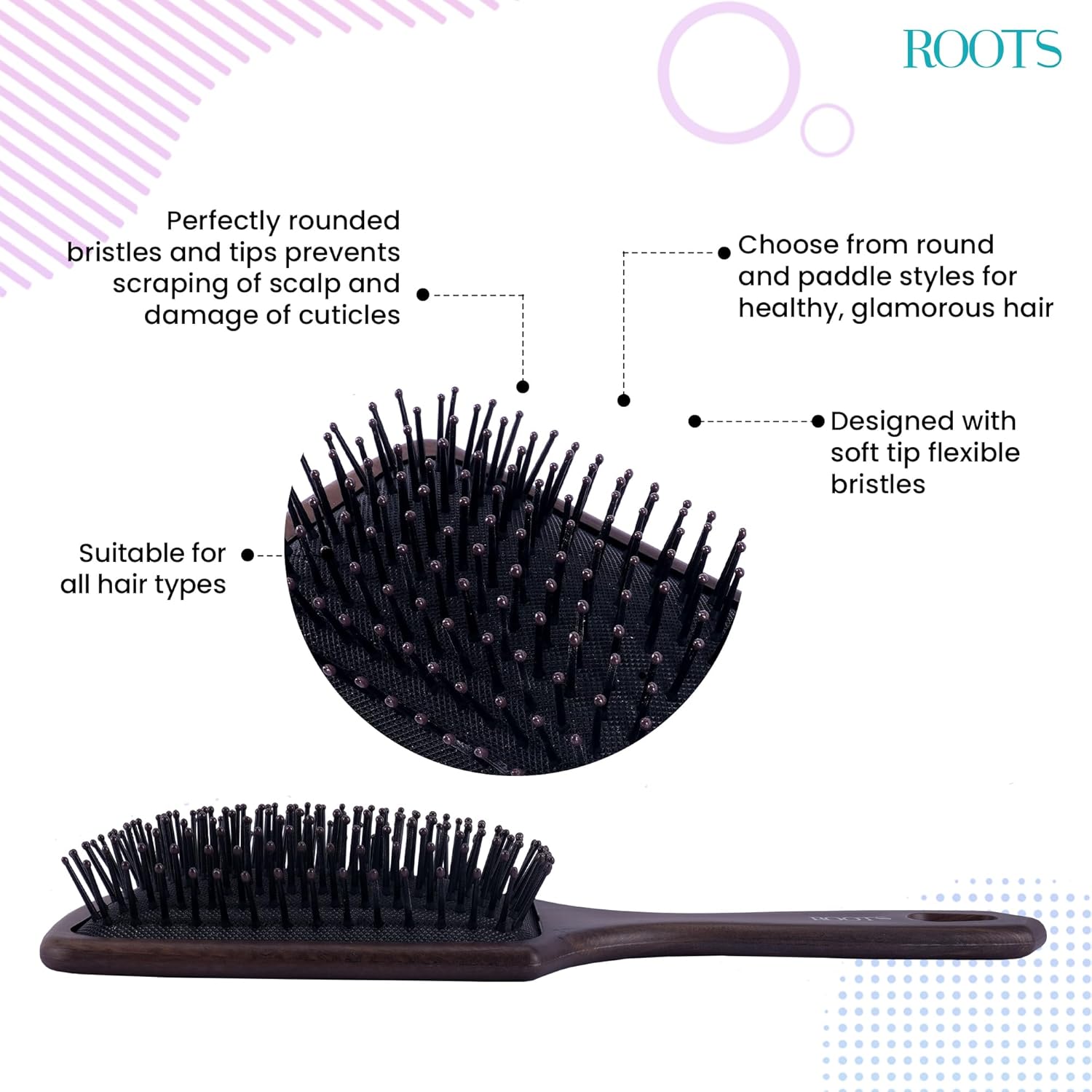 ROOTS Truglam Paddle Hair Brush | Soft Tip Flexible Bristles | Prevent Scalp Scraping & Cuticle Damage |Length - 9.7 Inch, Model No - WDRP03