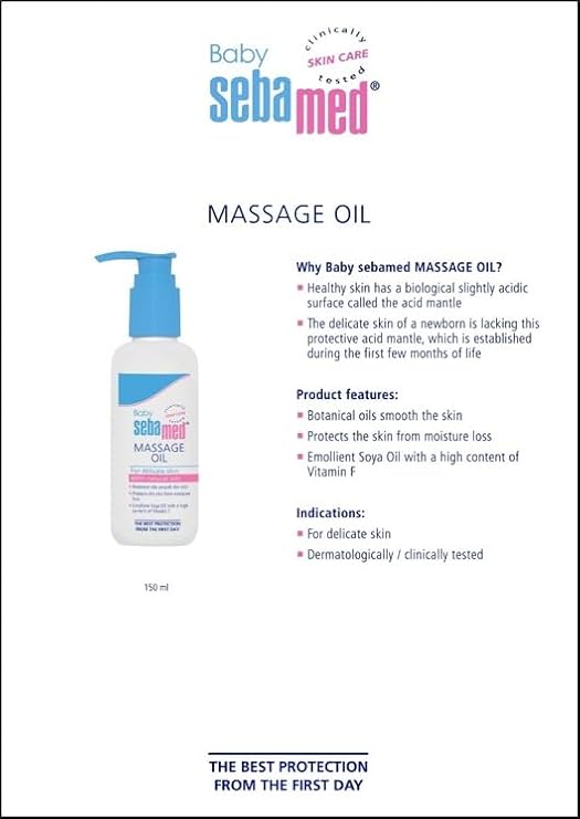 100 Percent botanical non sticky massage oil. Superior spread ability and faster absorption. Conventional massage oils contain mineral oil, colorants and other irritants which can cause allergic reactions. Sebamed soothing massage oil contains 95 percent soy oil contains essential fatty acids which ensures superior hydration. 5 Percent wheat germ oil is the richest source of vitamin e. Sebamed soothing massage oil does not solidify at lower temperature made in Germany gentle care and protection of baby’s sensitive skin emollient with 95 percent natural soya oils high content of formula with vitamin f, a soya oil compound, insures high skin tolerability gentle protection for delicate baby skin ideal from day 7 2 years0 percent irritant reactions and almost 0 percent allergic reactions.
