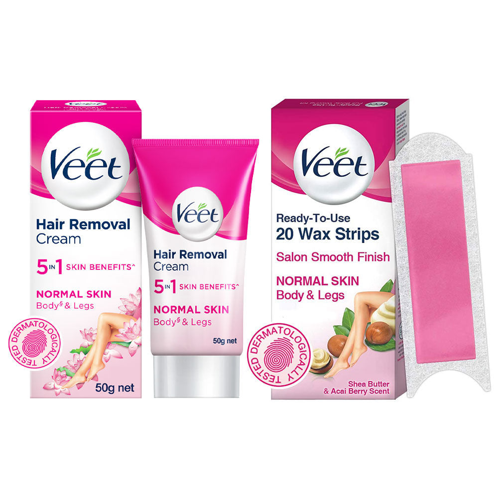 Veet Full Body Hair Removal Kit for Normal Skin - 20 Wax Strips (Arms & Legs) + Hair Removal Cream